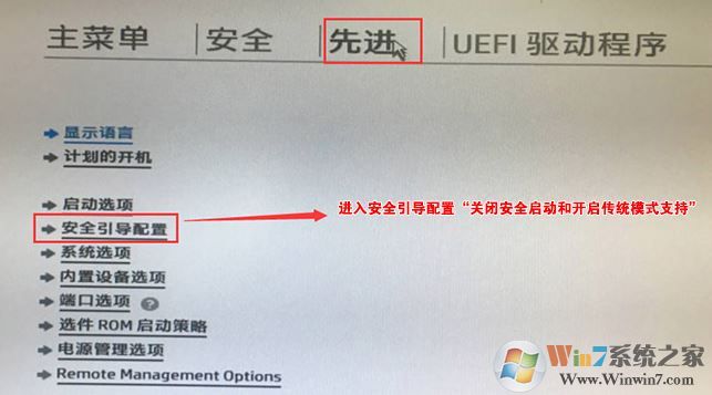 2、进入BIOS后,将移动键盘到“先进”选项下,选择"安全引导配置",按回车键进入设置;