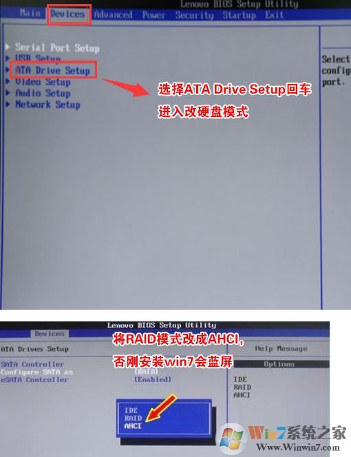 4、切将键盘移动Devices选项,把键盘移动ATA Drive Setup回车,将configure SATA as中默认的raid改成ahci模式,否则安装win7时会出现0x0000007b蓝屏,因为win7中没有集成raid硬盘驱动,然后选择F10保存设置,在弹出的选项中选择YES,如下图所示;