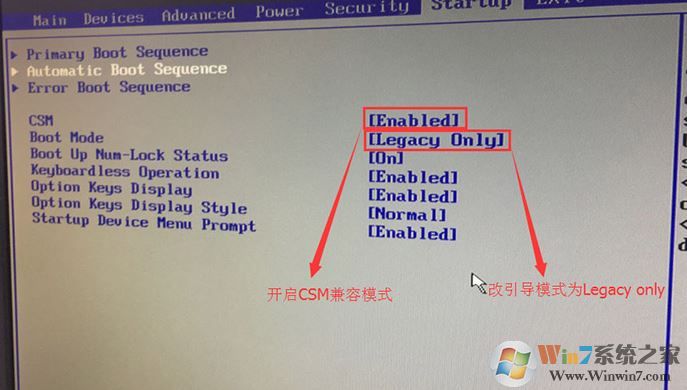 3、切换到Boot,把Boot Mode从UEFI改成Legacy only引导模式,再把csm默认disabled改成enabled,开启兼容模式,选择F10保存设置,在弹出的选项中选择YES;