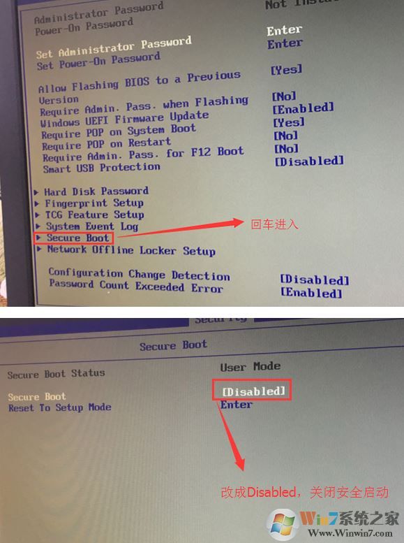 1、开机一直按F2或(FN+F2)进入BIOS,按→方向键切换到Security,选择Secure Boot回车设置成Disabled,安全启动必须关闭才能安装win7,可以采用uefi+gpt格式安装;