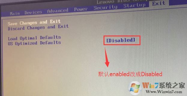 2、转到Exit,把OS Optimized Defaults设置为Disabled;