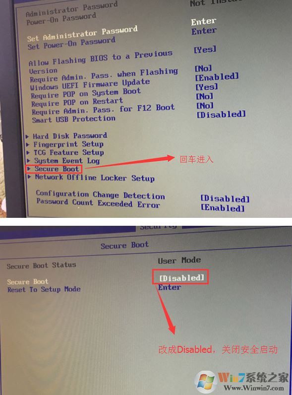 1、开机一直按F2或(FN+F2)进入BIOS,按→方向键切换到Security,选择Secure Boot回车设置成Disabled;