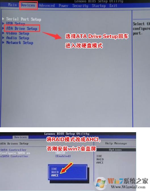 4、切将键盘移动Devices选项,把键盘移动ATA Drive Setup回车,将configure SATA as中默认的raid改成ahci模式,否则安装win7时会出现0x0000007b蓝屏,因为win7中没有集成raid硬盘驱动,然后选择F10保存设置,在弹出的选项中选择YES,如下图所示;