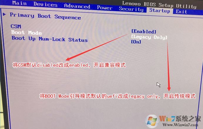 3、切换到Boot,把Boot Mode从UEFI改成Legacy only引导模式,再把csm默认disabled改成enabled,开启兼容模式,选择F10保存设置,在弹出的选项中选择YES;