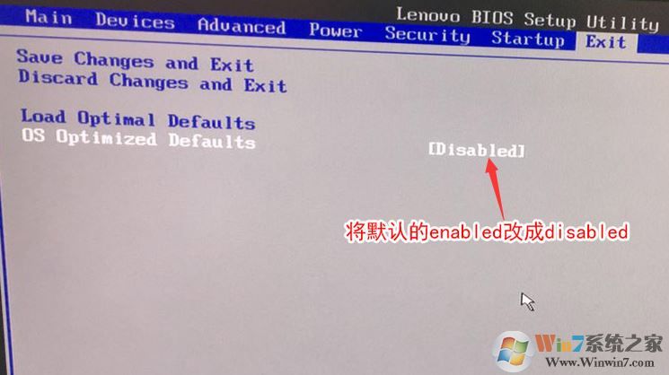 2、转到Exit,把OS Optimized Defaults设置为Disabled;