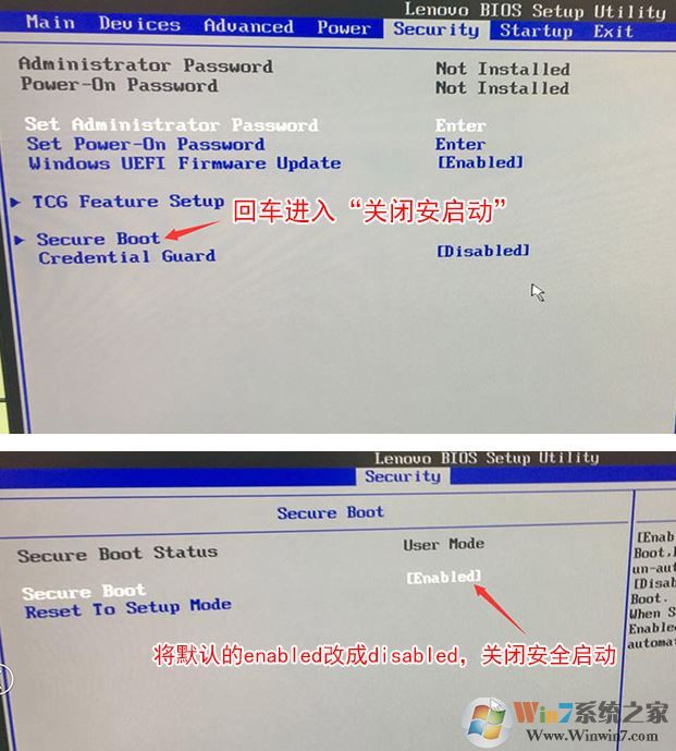 1、开机一直按F2或(FN+F2)进入BIOS,按→方向键切换到Security,选择Secure Boot回车设置成Disabled;