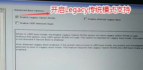 3、切换到Advanced Boot Options将右边的Enable legacy option roms选项打勾,如下图所示;