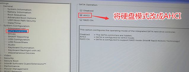 4、切换到system configuration项,将sata operatior硬盘模式改为ahci模式,否则安装win7会同现0x0000007b蓝屏,如下图所示;