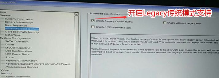 3、切换到Advanced Boot Options将右边的Enable legacy option roms选项打勾,如下图所示;