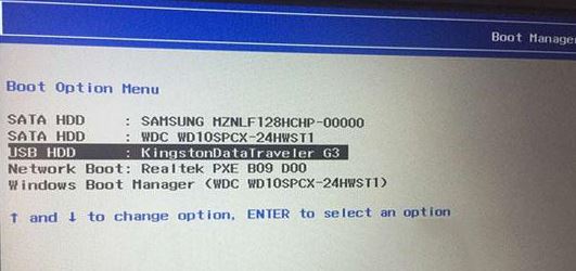 7、插入制作好的U盘启动盘,重启按F12或FN+F12调出启动管理对话框,选择USB HDD识别到U盘启动进入PE,回车进入PE: