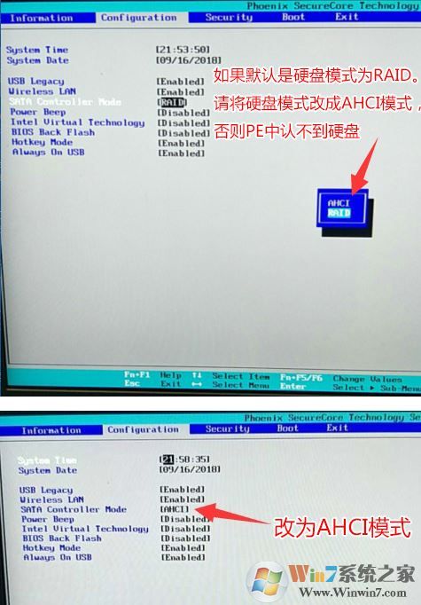 6、注意:再返回configuration这项,查看sata controller mode这项,如果默认硬盘模式为RAID,请将硬盘模式改为AHCI模式,否则进PE后不能认出硬盘,如果更改后记得按F10保存,如下图所示;