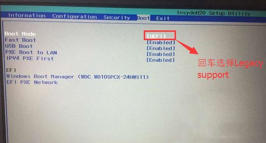 4、切换到Boot,把Boot Mode从UEFI改成Legacy Support;