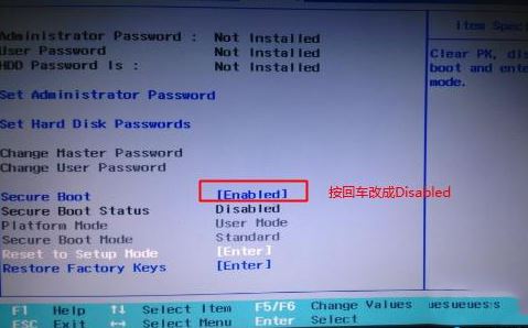 1、开机一直按F2或(FN+F2)进入BIOS,按→方向键切换到Security,选择Secure Boot回车设置成Disabled,如下图所示;