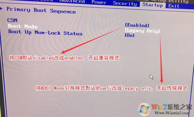 3、切换到Boot,把Boot Mode从UEFI改成Legacy only引导模式,再把csm默认disabled改成enabled,开启兼容模式,选择F10保存设置,在弹出的选项中选择YES;