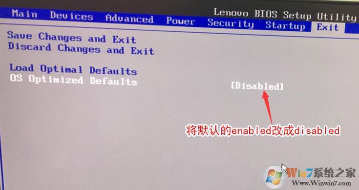 2、转到Exit,把OS Optimized Defaults设置为Disabled;