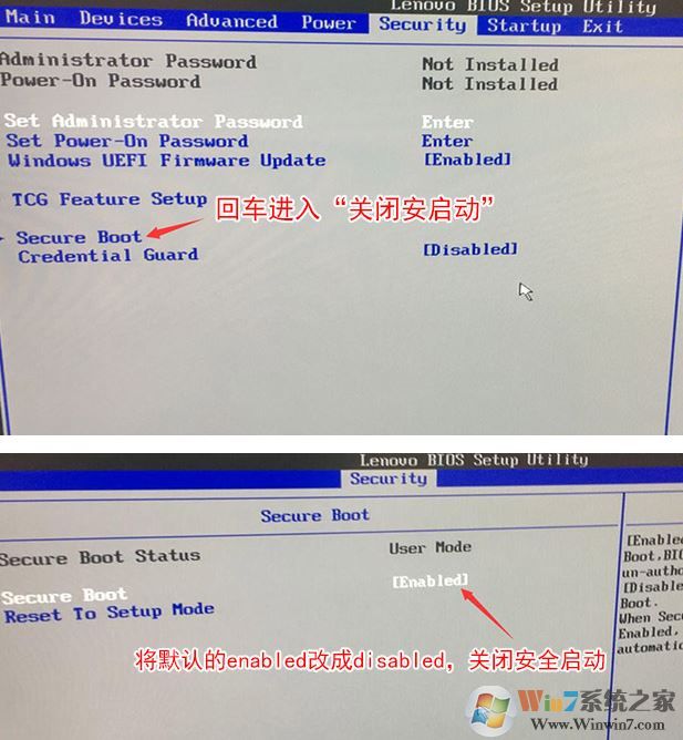 1、开机一直按F2或(FN+F2)进入BIOS,按→方向键切换到Security,选择Secure Boot回车设置成Disabled;