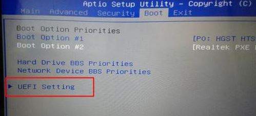 2、转到Boot界面,选择UEFI Setting回车;
