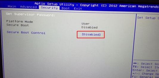 1、重启笔记本按F2进入BIOS设置,在Security下把Secure Boot Control设置为Disabled关闭安全启动,安装win7必须要关闭的一项,否则安装后可能引导不了,如下图所示;