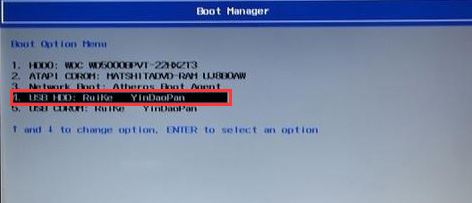5、插入U盘启动盘,重启时不停的按下f12,打开Boot Manager,选择USB HDD回车从U盘启动,如下图所示;