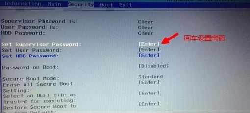 2、如果Secure Boot灰色无法设置,则转到Security,选择Set Supervisor Password回车设置密码,再返回BOOT选项,将Secure BOOT默认enabled为disabled,(注:改完secure boot后再设置密码为空即可,要不每次进BIOS都要设置)如下图所示;