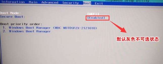 1、将电脑重启一直按F2进入BIOS,按F2进入BIOS界面,选择BOOT项后发现secure boot灰色不可选状态,如截图: