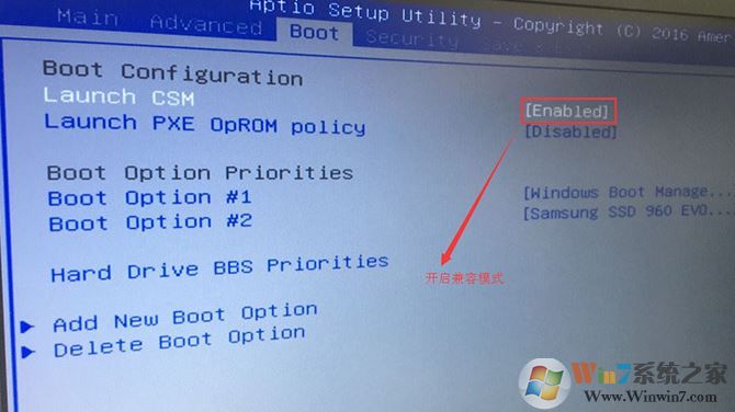 2、切换到BOOT的选项,把Launch CSM由disabled改成enabled,开启兼容模式,然后按F10保存设置;