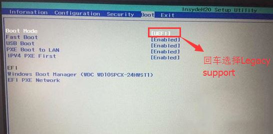 4、切换到Boot,把Boot Mode从UEFI改成Legacy Support;