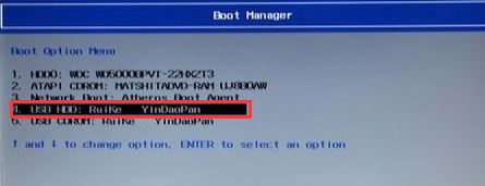 5、插入U盘启动盘,重启时不停的按下f12,打开Boot Manager,选择USB HDD回车从U盘启动,如下图所示;