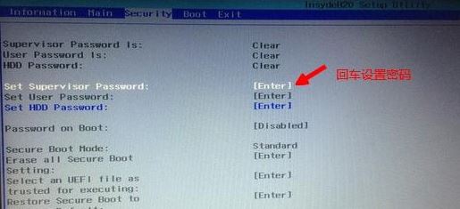 2、如果Secure Boot灰色无法设置,则转到Security,选择Set Supervisor Password回车设置密码,再返回BOOT选项,将Secure BOOT默认enabled为disabled,(注:改完secure boot后再设置密码为空即可,要不每次进BIOS都要设置)如下图所示;