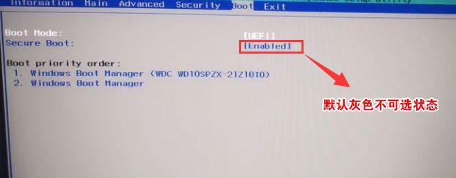 1、开机一直按F2进入BIOS,按F2进入BIOS界面,选择BOOT项后发现secure boot灰色不可选状态,如下图所示;