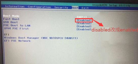 4、切换到Boot,把Fast Boot从Disabled改成Enabled,开启快速启动设置U盘启动;