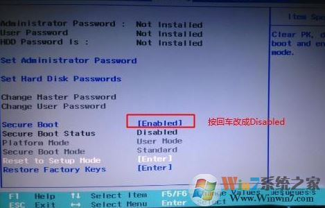 1、开机一直按F2或(FN+F2)进入BIOS,按→方向键切换到Security,选择Secure Boot回车设置成Disabled;