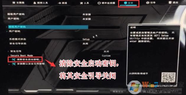 2、使用键盘方向键右键切换到"安全"选项,选择下面的“清除安全启动密钥”将其关闭安全启动安装win7,如下图所示;