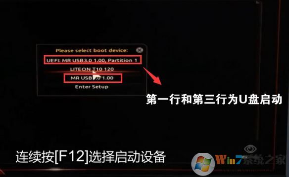 6、插入U盘启动盘,重启不停的按F12,选择识别到U盘启动项(默认有uefi U盘启动和传统模式,这里记得要uefi启动的就要制作支持uefi的U盘启动),回车