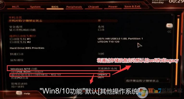 4、再将默认windows8/10选项改成操作系统类型改成"其它操作系统"(ohter os)选项并,并将通过存储设备启动默认的uefi改成legacy引导,如下图所示;