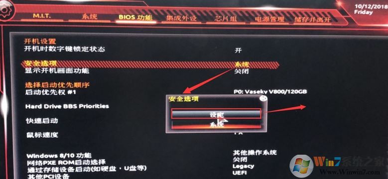 3、按键盘方向键右键切换到BIOS选项,将安全选项由默认的“系统”改为“设定”关闭安全启动,如图: