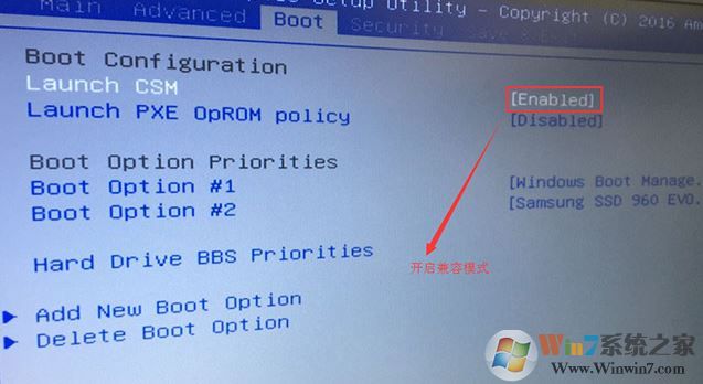 2、切换到BOOT的选项,把Launch CSM由disabled改成enabled,开启兼容模式,然后按F10保存设置;