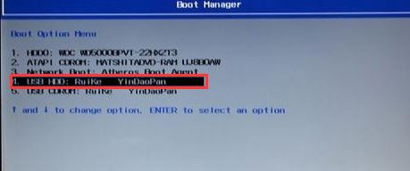 4、插入U盘启动盘,重启时不停的按下f12,打开Boot Manager,选择USB HDD回车从U盘启动,如图所示;