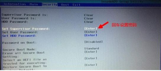 2、如果Secure Boot灰色无法设置,则转到Security,选择Set Supervisor Password回车设置密码,再返回BOOT选项,将Secure BOOT默认enabled为disabled,(注:改完secure boot后再设置密码为空即可,要不每次进BIOS都要设置)如下图所示;