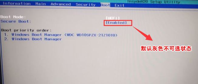 1、开机一直按F2进入BIOS,按F2进入BIOS界面,选择BOOT项后发现secure boot灰色不可选状态,如下图所示;
