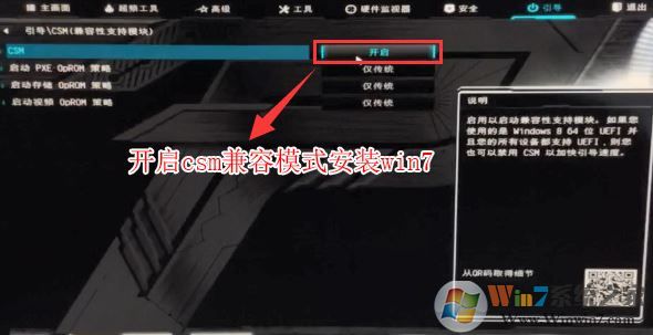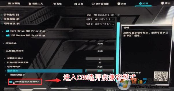 3、再键盘方向键右键切换到"引导"选项,进入csm菜单开启“兼容模式”,如图所示;