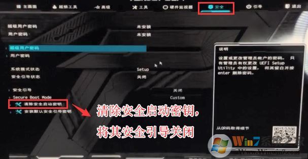 2、按键盘方向键右键切换到"安全"选项,选择下面的“清除安全启动密钥”将其关闭安全启动安装win7,如图所示;