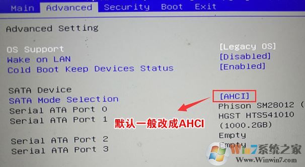 4、再将移动上下方向键,移动到Advanced中将SATA Mode Selection选项的启动项更改为AHCI,否则安装WIN7会出现0x00007b蓝屏,如下图所示,然后再F4保存设置,如图: