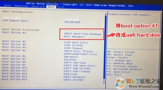 3、再将移动上下方向键,移动将Boot Option #1选项的启动项更改为UEFI Hard Disk:Windows Boot Manager,如下图所示,然后再F4保存设置,如图: