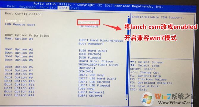 2、再将移动左右方向键,移动到BOOT选项卡下,将Launch CMS更改为Enable,开启兼容模式,如图: