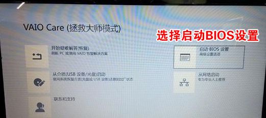 2、进入VAIO Care(拯救大师模式),选择“启动BIOS设置”设置,如图所示;