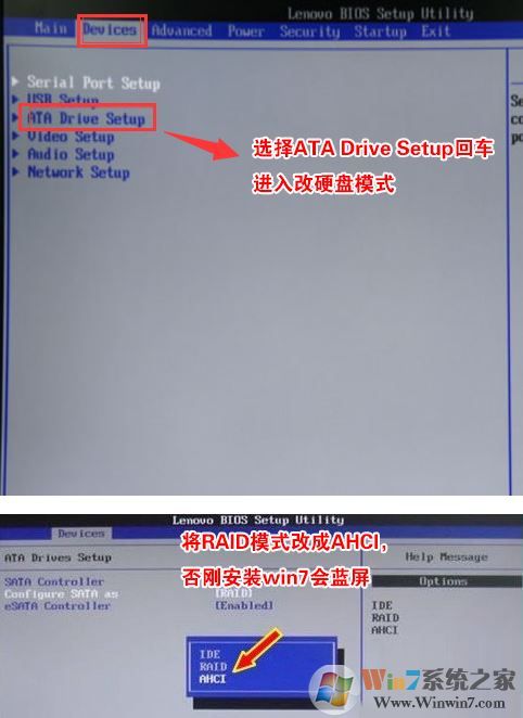 4、切将键盘移动Devices选项,把键盘移动ATA Drive Setup回车,将configure SATA as中默认的raid改成ahci模式,否则安装win7时会出现0x0000007b蓝屏,因为win7中没有集成raid硬盘驱动,然后选择F10保存设置,在弹出的选项中选择YES,如下图所示;