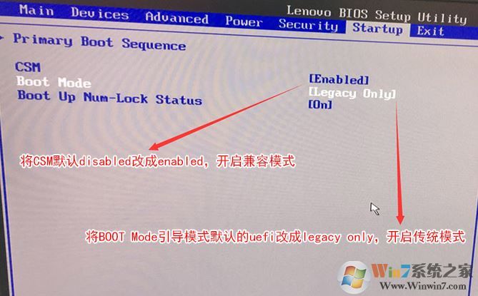 3、切换到Boot,把Boot Mode从UEFI改成Legacy only引导模式,再把csm默认disabled改成enabled,开启兼容模式,如下图所示;