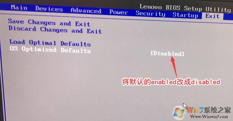 2、转到Exit,把OS Optimized Defaults设置为Disabled;