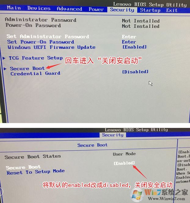1、开机一直按F2或(FN+F2)进入BIOS,按→方向键切换到Security,选择Secure Boot回车设置成Disabled;